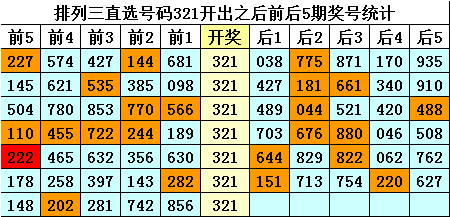 四、陈列三直选号码321历史上开出7次,其前后五期奖号永别为: