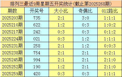三、体彩陈列三前9周星期五奖号永别开出:735-622-242-021-258-754-994-190-420,其中号码012路比为8:8:11,奇偶比为11:16,大小比为10:17;