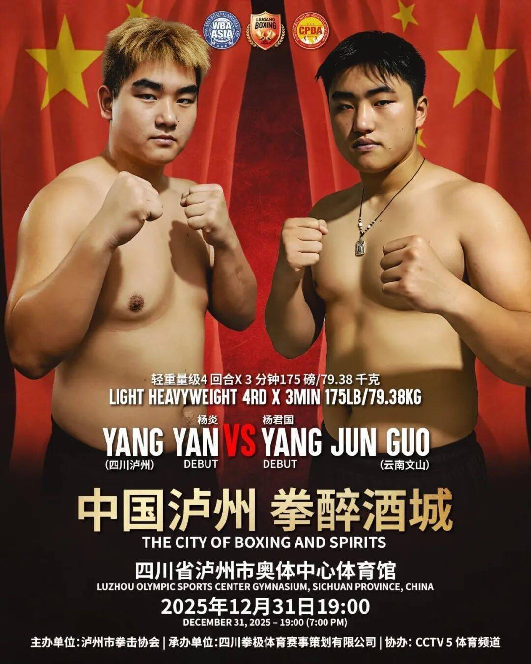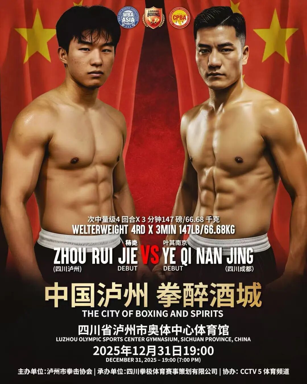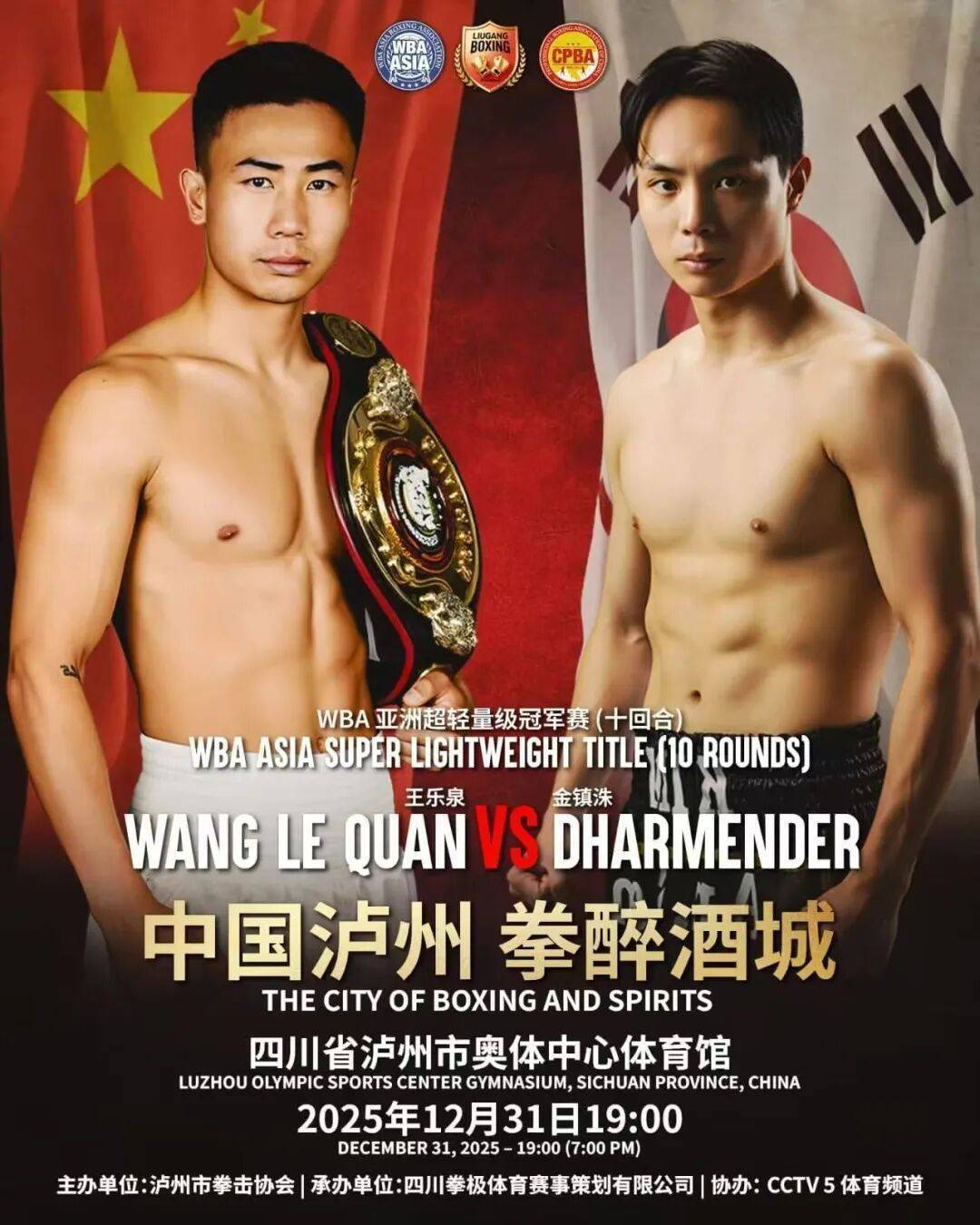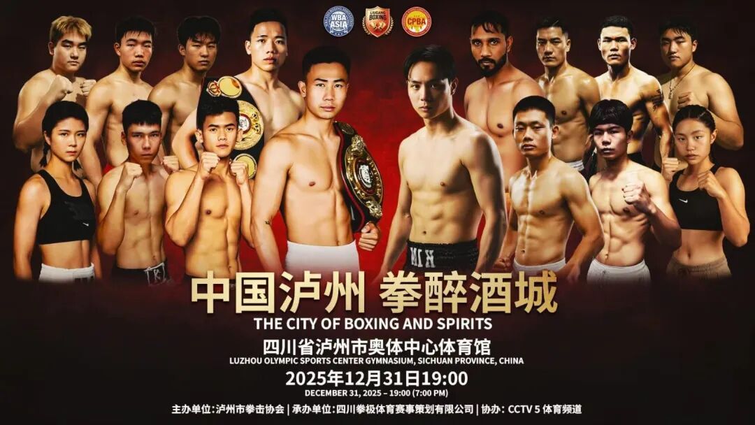2025年12月31日19:00,“中国泸州 拳醉酒城”WBA亚洲拳王争霸赛将火爆打响,让咱们相约泸州市奥体中心体育馆,一同见证中国力量向世界之巅进发!