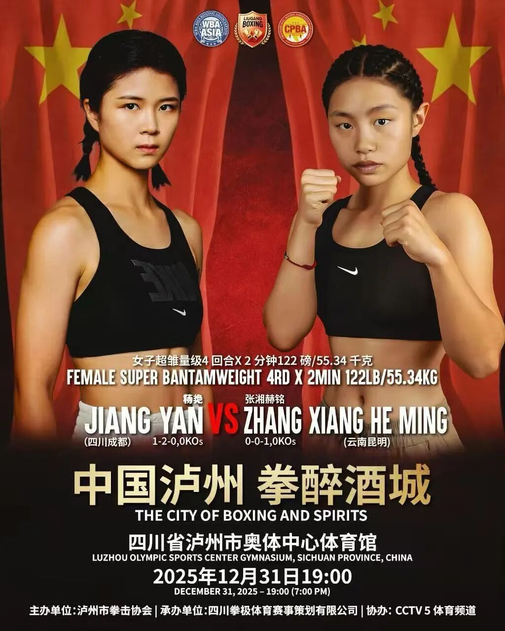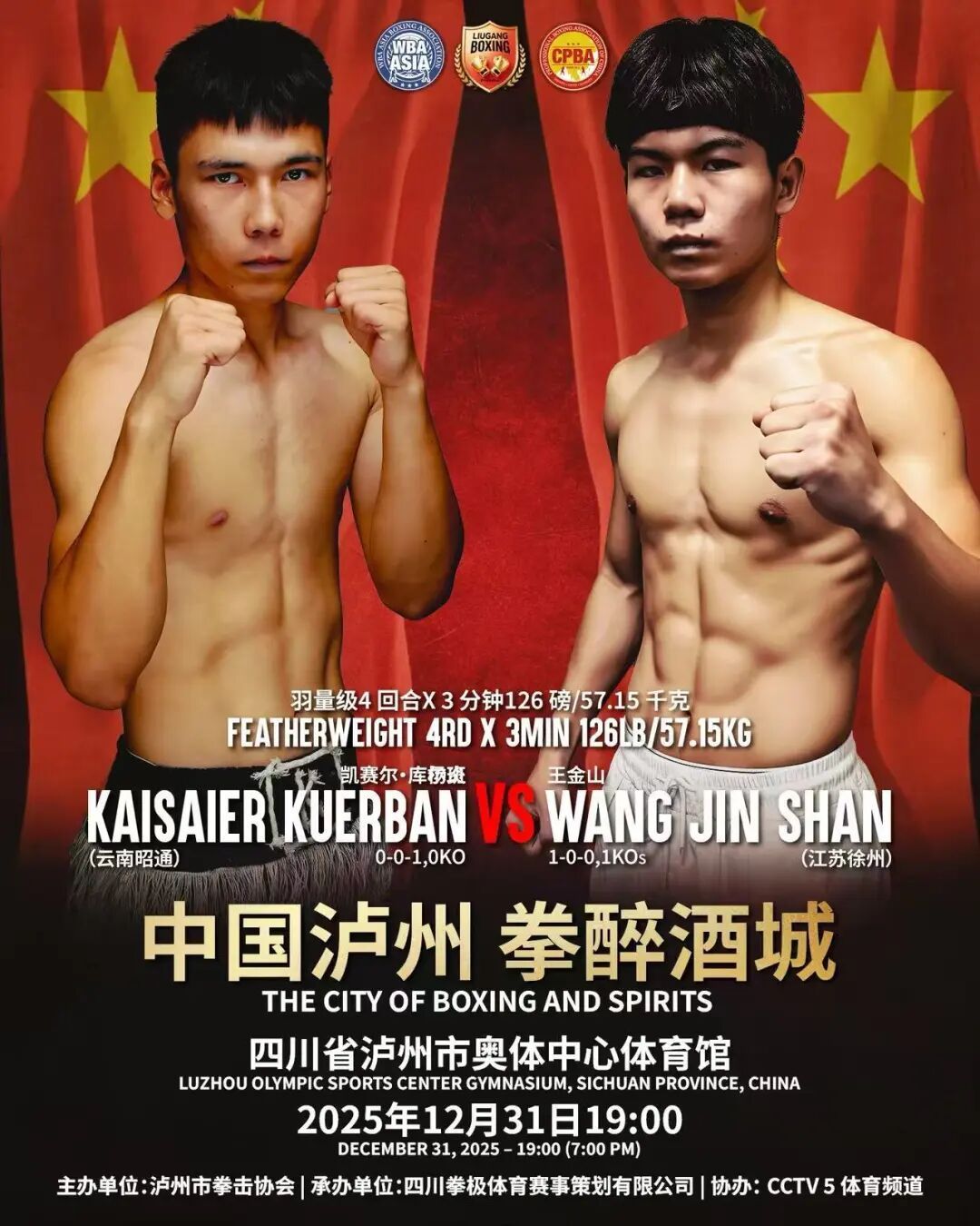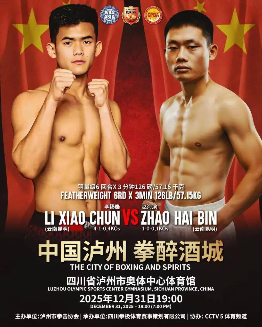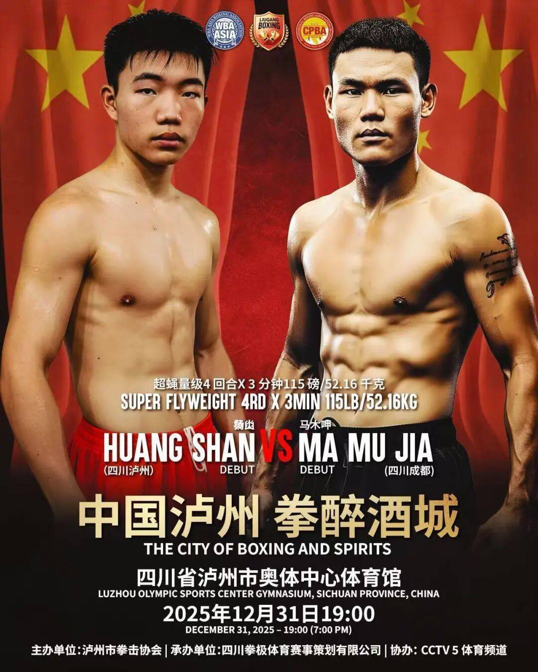2025年12月31日19:00,“中国泸州 拳醉酒城”WBA亚洲拳王争霸赛将火爆打响,让咱们相约泸州市奥体中心体育馆,一同见证中国力量向世界之巅进发!