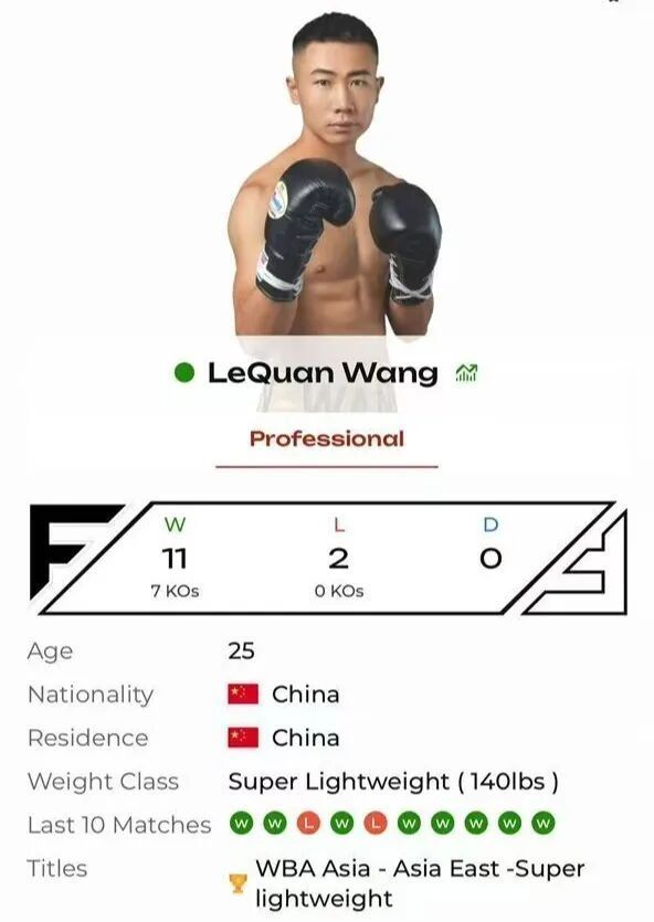 现年26岁的王乐泉是连年来中国拳坛上涨势头最迅猛的重生代拳手之一,他出身于江苏徐州丰县,身高和臂展均为1米73,主打140磅。外形俊朗的王乐泉虽莫得业余拳击基础,但从9岁运转习武,擅长拳法、形意拳及实战散打。2018年,王乐泉慕名未婚赶赴昆明名东说念主堂拳馆,跟闻明讲明林国伟和前WBA/WBC亚洲羽量级拳王韦宪钱从零基础运转学习拳击。自2019年步入业绩拳坛于今获取了13战11胜7场KO敌手的业绩战绩。